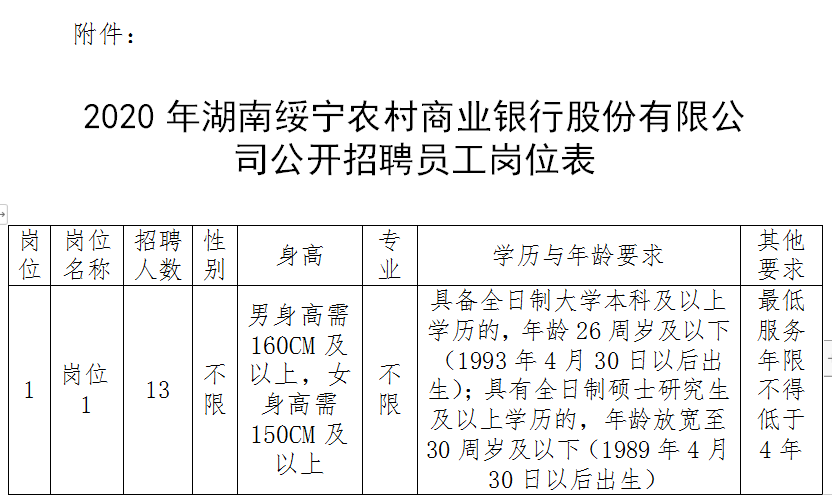 附件:《2020年湖南绥宁农村商业银行股份有限公司公开招聘员工岗位表》