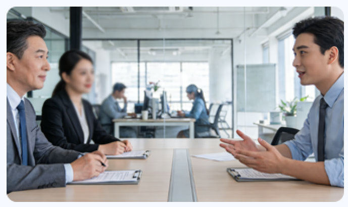 2-7名面试官,5-15分钟/人,以听题为主,随机追问;题量2-4题,围绕自我介绍、个人简历、求职动机、职业规划、业务能力等展开