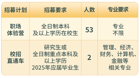招募对象面向研究生或全日制重点本科及以上学历2025年应届毕业生(在2025年12月31日前取得毕业证的在校生),管理、经济、财务、计算机、金融等相关专业,经统一笔试后开展实习,实习时长不低于2个月(40个工作日)。实习结束,经综合考核通过后可直接录用。