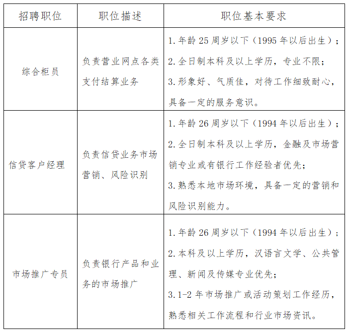 广丰广信村镇银行(以下简称广信银行)是经中国银保监会批准设立的全市首家村镇银行,广信银行始终以“同样的银行、不同的服务”为服务理念,坚持扎根村镇、服务地方,积极投身地方经济建设及社会责任践行,为我区农村金融发展做出了重要贡献。广信银行成立十年来,各项业务发展迅速,先后成立了营业部、客户部、风险合规部等九个部门,下设广场支行、洋口支行、五都支行、下溪支行四个分支机构,业务覆盖面及金融服务不断延伸。现因业务发展及人才储备需要,现面向社会公开招聘,具体要求如下:
