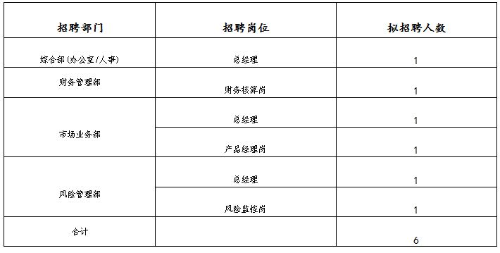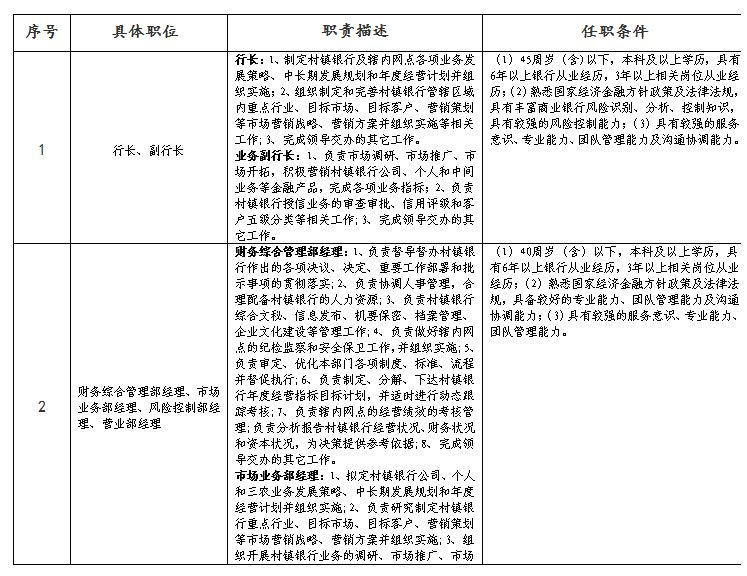 目前筹建工作已全面铺开,现对外公开诚聘英才,共创伟业。我们将为您提供广阔的事业发展空间和金融同业更具竞争力的薪酬待遇,诚邀社会各界优秀人士加盟。