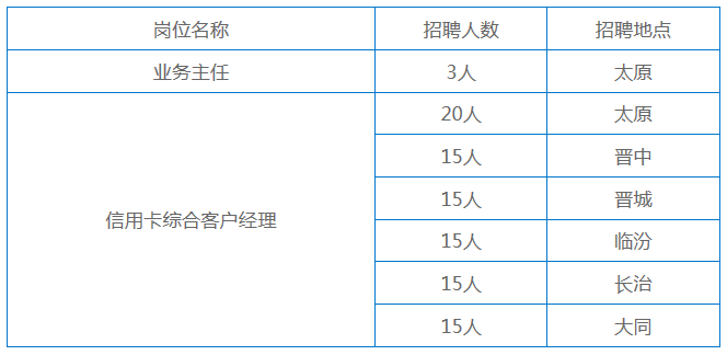 山西经济社会发展,服务三晋百姓生活,依法经营,稳健经营,文明经营,业务持续快速健康发展,风险控制能力不断增强,盈利水平显著提升。现因业务发展及内部管理需要,特面向社会人员公开招聘信用卡中心业务岗优秀人才。现将有关事项公告如下: