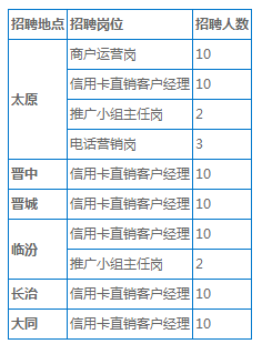 山西经济社会发展,服务三晋百姓生活,致力于为客户提供全面、优质、高效的金融服务。现因业务发展及内部管理需要,特面向社会人员公开招聘信用卡中心业务岗优秀人才。现将有关事项公告如下: