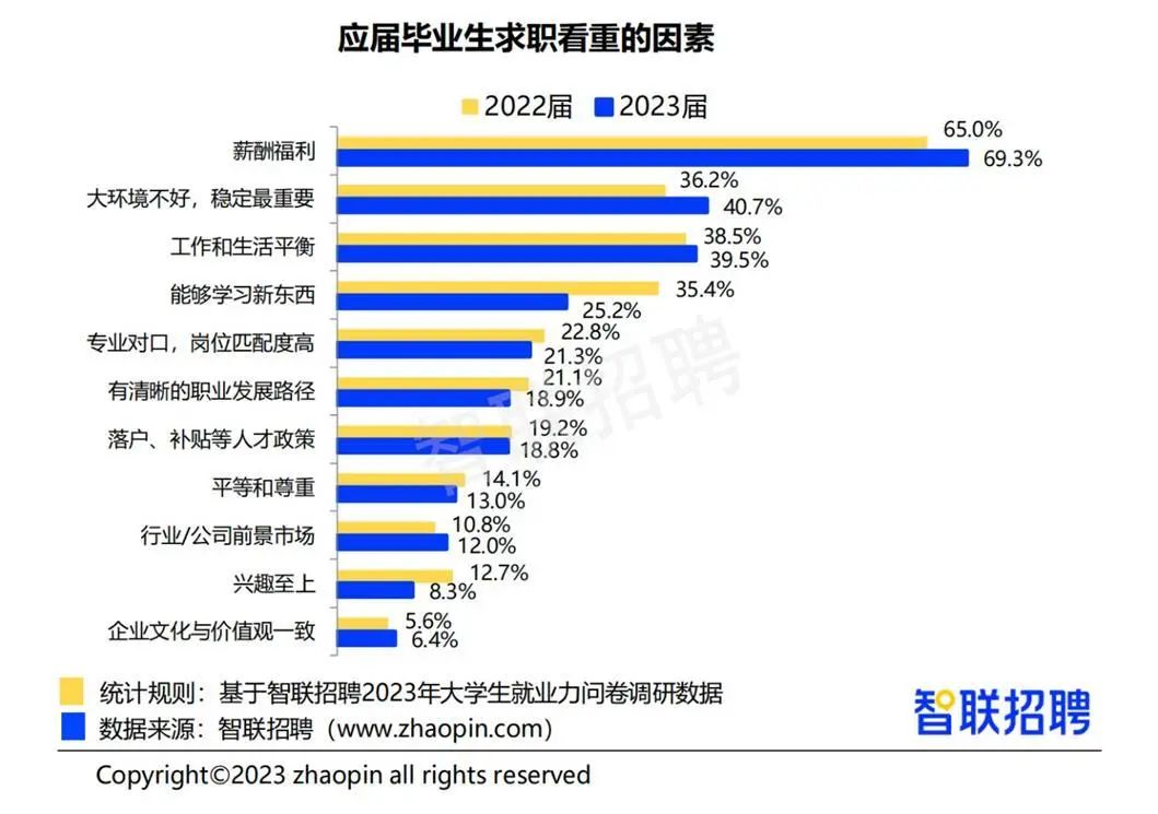 在智联招聘近日发布的《2023大学生就业力调研报告》中,从毕业生求职关注的因素看,薪酬福利也是首要关注点,占比69.3%,也就是说,近7成毕业生都更关注企业的薪酬待遇。