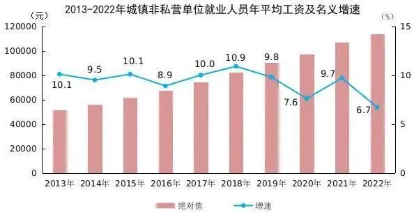 2022年全国城镇非私营单位就业人员年平均工资为114029元,比上年增加7192元,名义增长6.7%。扣除价格因素,2022年全国城镇非私营单位就业人员年平均工资实际增长4.6%。