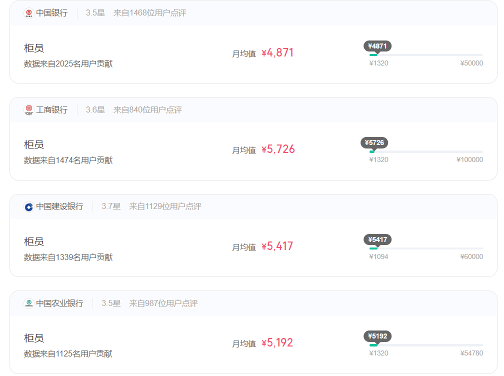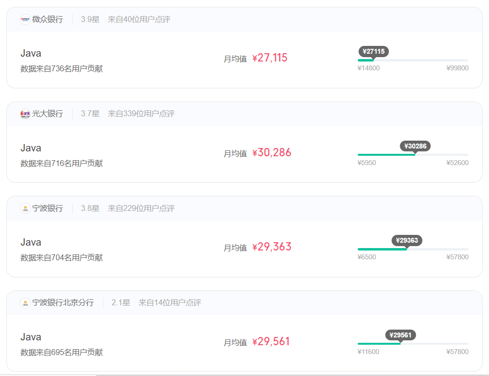 在了解各岗位的薪资之前,同学们先参考一下各家银行的平均薪资水平,一般来说,各岗位的薪资受银行整体的薪资影响也比较大。
