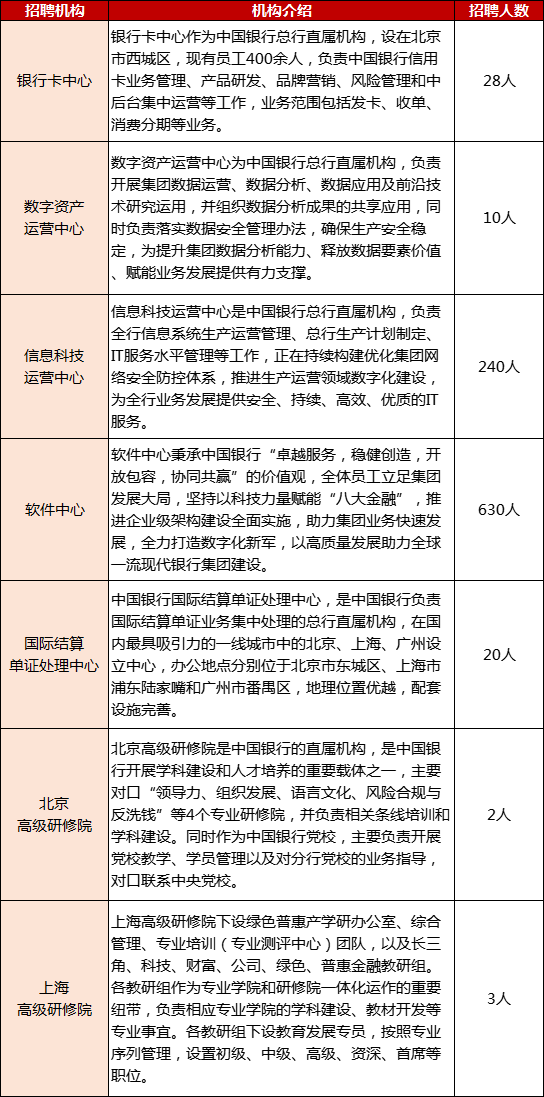 中国银行招聘的公告为例,共有7家总行直属机构招聘,共招聘933人。