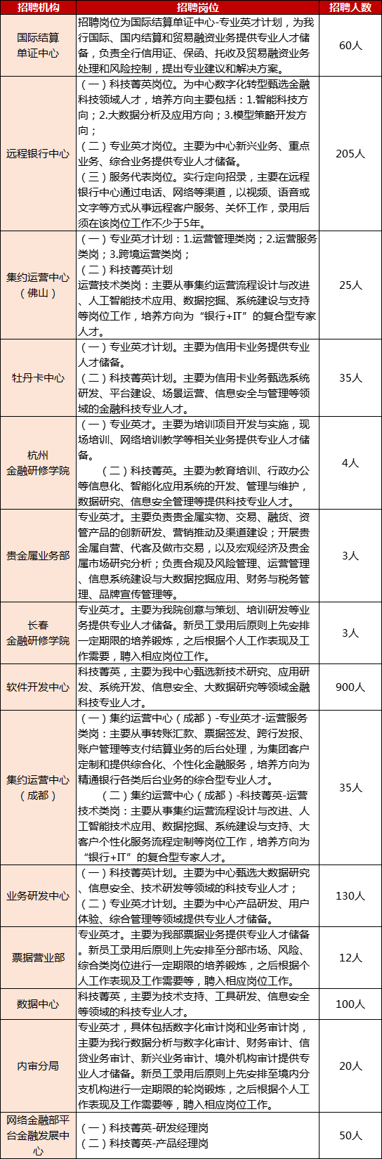 四大行每年秋招报名,除了各分行招聘人数较多外,银行的直属机构也是比较好的去处,尤其是对不想报名营销岗或者想专职从事科技岗的同学们来说,各大银行的直属机构可是非常nice的,今天小编就给大家介绍一下各大银行直属机构的招聘条件及岗位。