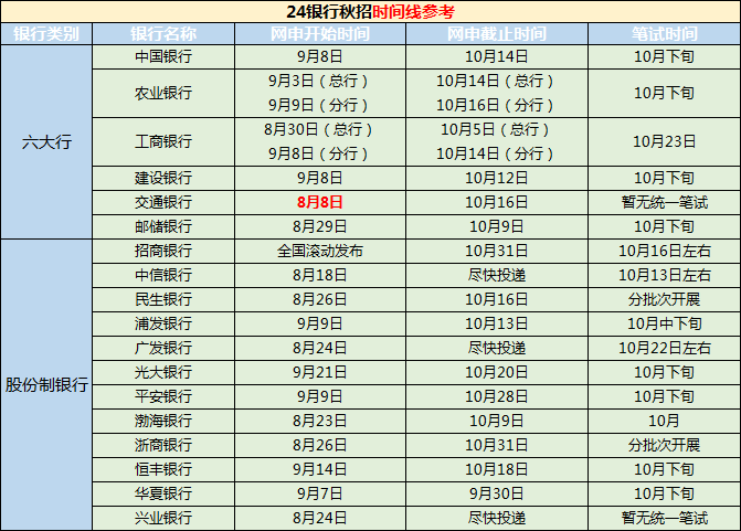 从网申时间线可以看出来,几家较大的股份制商业银行秋招开启的时间都比较早,且一般都在六大行之前。部分银行如