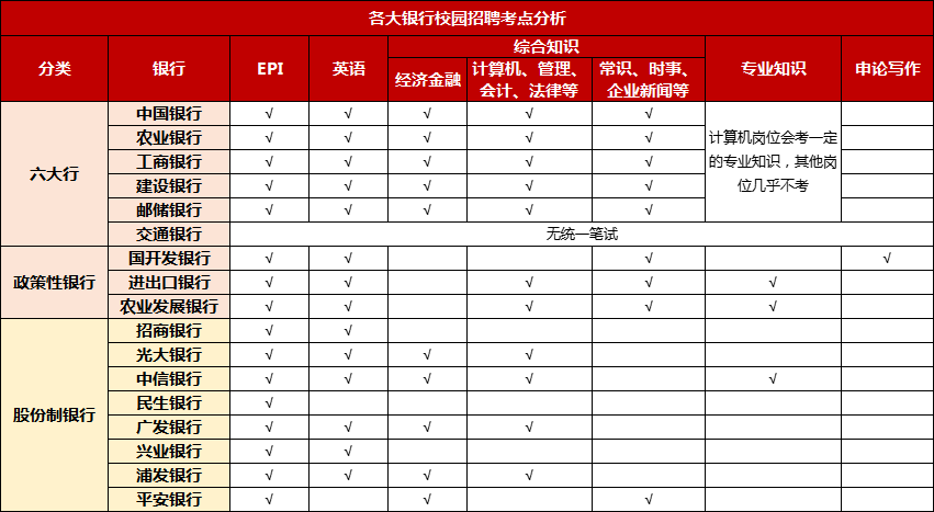 关于笔试复习,同学们可以先看看下面的各银行考点分析:
