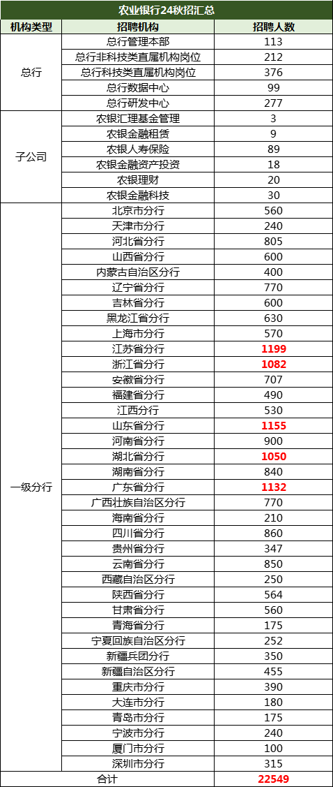 农业银行今年总行、2家总行直属机构、37家分行及6家子公司进行招聘,整体招聘22500+!23/24届可报!专业不限!