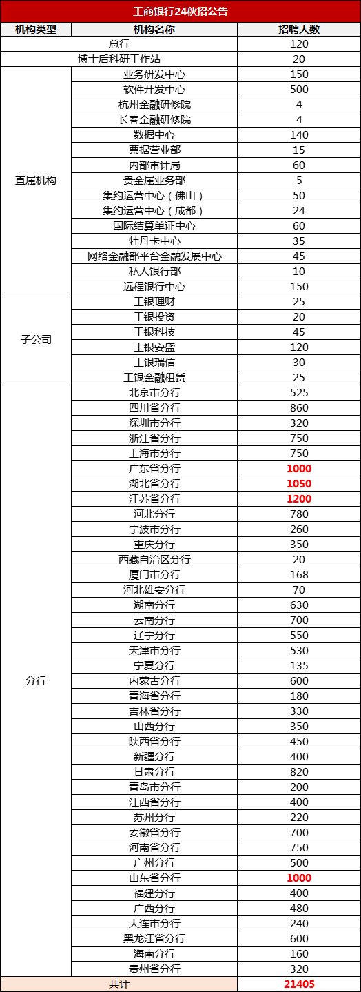工商银行今年有39家一级(直属)分行、15家直属机构及6家综合化子公司招聘,整体招聘21000+,22-24届可报!
