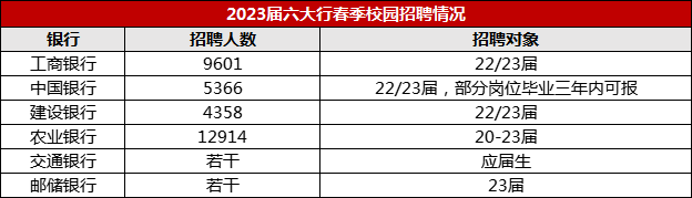 像国有六大行、12家股份制银行、多省份的农商行等,都会开启春季校园招聘,春招招聘人数虽然没有秋招多,但比起部分央国企,银行招聘人数还是非常多的!