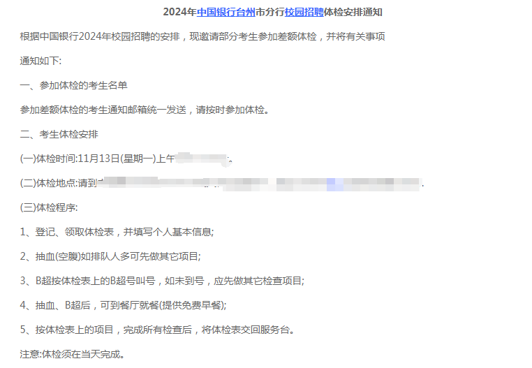 台州分行的体检就告知了体检的时间、地点以及体检程序。