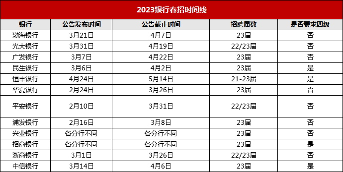 沈阳分行的春季校园招聘,就在公告中明确写明了各批次的报名截止时间。而一般来说,针对每批次网申成功的同学,各个银行将会单独进行笔试及面试考核,也就是说股份制银行可能有不止一次的全国性笔试统考,有的银行也可能在3月份的时候就开始笔试了~