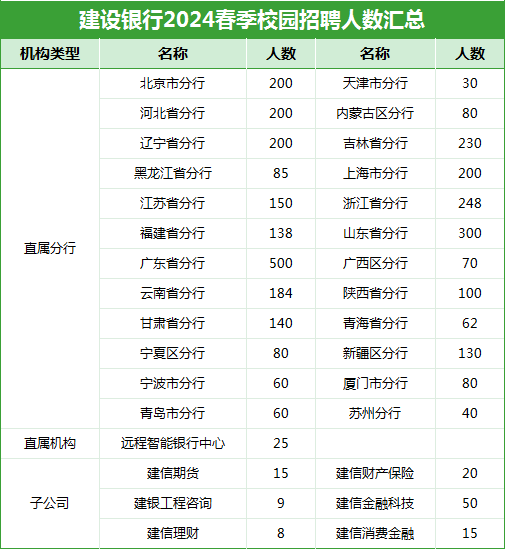 建设银行今年春招招聘机构及人数在国有大行中相对较少,为3700+人,但相比于其他银行来说,建行的待遇和福利都要好一些,因此如果有合适的岗位,各位同学也不妨进行报名哦~