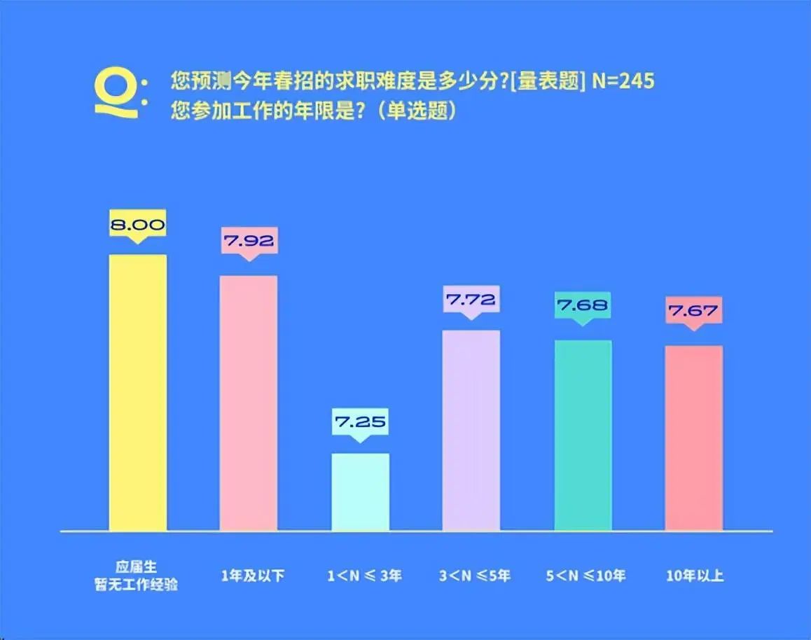 近年来,应届生找工作的压力越来越大,而根据脉脉《工作性价比时代-2024春招人才求职偏好洞察》,2024年春招,职场人普遍认为求职难度偏高,平均分达到了7.65分,应届生对求职难度的感受最为强烈,平均评分高达8分(10分为最难)。