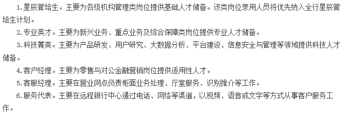 因此相对来说,对于管培生和科技菁英岗位,在校园招聘时竞争压力肯定是比较大的,尤其是省分行的岗位,总体建议重点院校毕业的同学们报名。