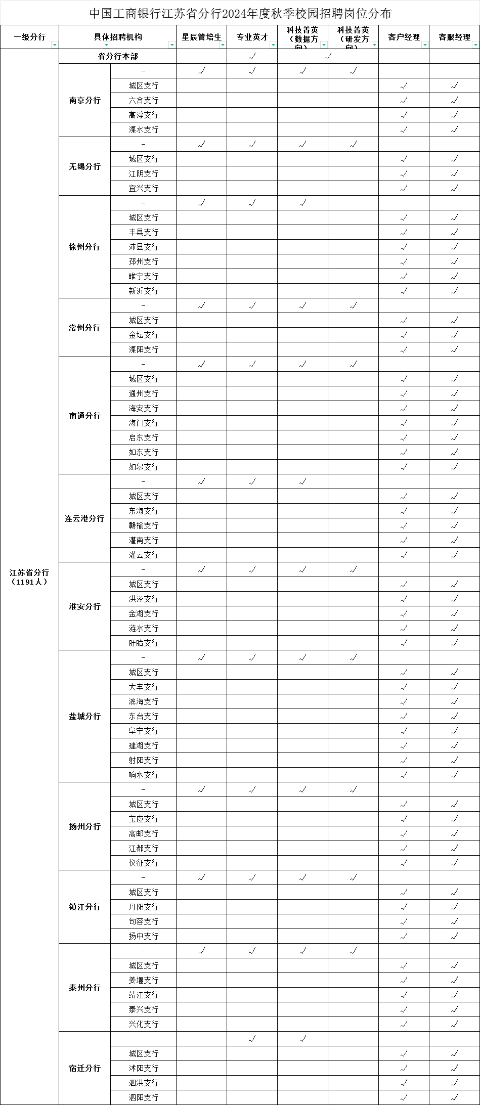 对于绝大部分同学来说,想要报名银行且想要上岸,那么最好是报名分行或者是支行的岗位,我们先来看看去年工商银行江苏分行秋招的岗位分布图: