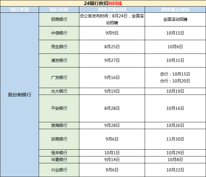 基本上从进入8月份之后,尤其是8月中下旬,几乎每天都有股份制银行可能发布公告,同时股份制银行一般都采取分批次笔面试,因此想考股份制银行的同学一定要提前做好准备才行!