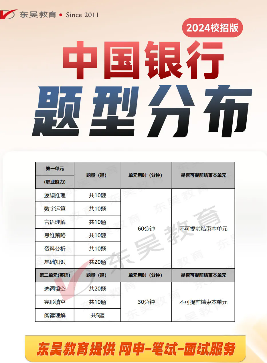 中国银行笔试往年素有时长短,题量多的特点,其中英语题量大,但相比其他银行较简单,EPI主要考察数量关系、言语理解、判断推理、资料分析,综合知识则包括经济、金融、时政、常识、管理等。