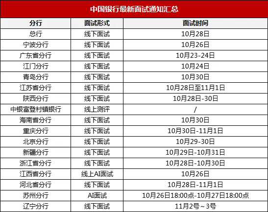 截止10月26日下午17:00,中国银行第一批面试通知汇总如下: