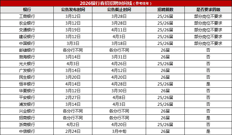 银行春招一般在1月中旬左右陆续开启,2月底-3月中旬为高峰期,主要招聘25/26届应届生。