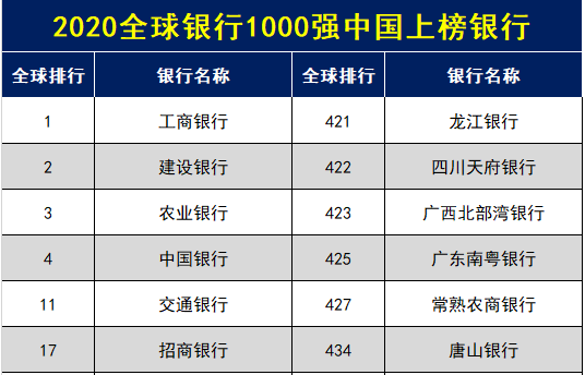 2020年7月,英国《银行家》杂志公布了“2020年全球银行1000强”排行榜,榜单根据一级资本实力来衡量银行资本充足状况进行排行,中国银行排名第4位。