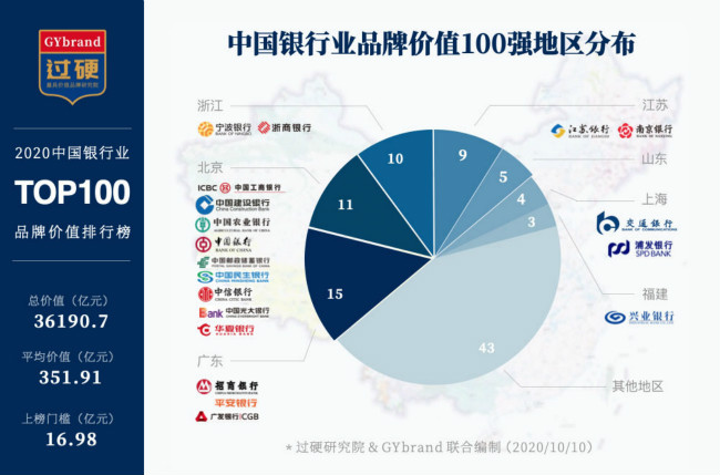 根据过硬研究院发布的《2020中国银行业TOP100品牌价值排行榜》,从地区分布来看,上榜数量最多的广东共有15家,品牌总价值4909亿元。