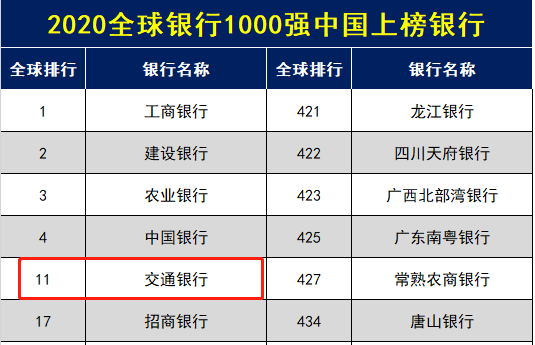2020年7月,英国《银行家》杂志公布了“2020年全球银行1000强”排行榜,榜单根据一级资本实力来衡量银行资本充足状况进行排行,交通银行上榜,排名第11位。
