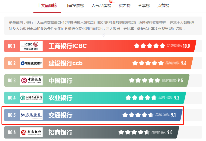 根据2021年银行十大品牌榜中榜,交通银行银行排名第五。银行十大品牌数据由CN10排排榜技术研究部门和CNPP品牌数据研究部门通过资料收集整理,并基于大数据统计及人为根据市场和参数条件变化的分析研究专业测评而得出,是大数据、云计算、数据统计真实客观呈现的结果。