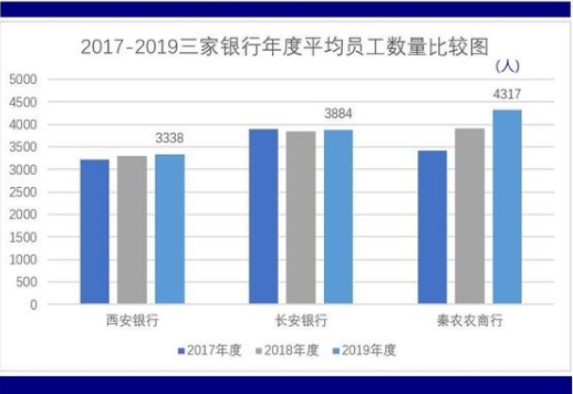 2019年末,西安银行、长安银行和秦农农商行3家机构的员工数量分别为3353人、3902人和4261人(均不含退休人员,但长安银行含派遣工,秦农农商银行不包含所控股三县农商银行的员工数量1008人)。
