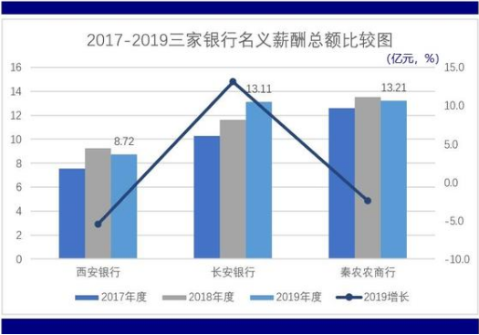 2019年度,西安银行、长安银行和秦农农商行3家机构的名义薪酬总额分别为8.72亿元、13.11亿元和13.21亿元(后者为母公司口径),分别比上年增长-5.4%、13.1%和-2.4%。也就是说,西安银行与秦农农商银行薪酬总额是同比减少的,当然减少幅度都很小。