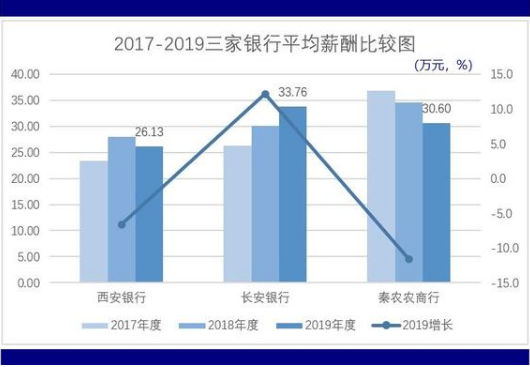 通过上述原始数据,我们可以测算出2017年至2019年西安银行年度平均薪酬分别为23.33万元、27.99万元和26.13万元;长安银行年度平均薪酬分别为26.34万元、30.10万元和33.76万元;而秦农农商银行三个年度的平均薪酬分别是36.89万元、34.60万元和30.60万元。