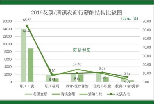 本文仅以花溪农商银行和清镇农商银行2家机构为例,进行薪酬总额(实际也对应平均薪酬)的结构分析。2019年,这2家机构的职工工资(包括资金、津贴等)占比分别为65.68%和64.49%。