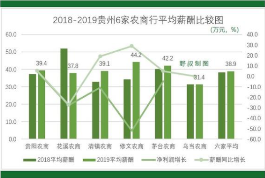 同时,这6家机构相比,互相之间的差异也很大。2018年平均薪酬最高的花溪农商银行约51.9万元,2019年度降幅也最大;2018年平均薪酬相对较低的修文农商银行,