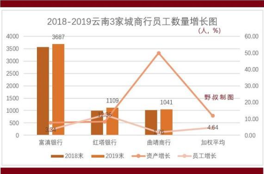 2019年末,上述3家城商银行员工数量合计5837人(如无特别注明文中涉及员工、资产、利润等数据均为母公司口径),同比增长4.64%;数值明显小于同期合计总资产11.83%的增幅,说明云南各城商银行的员工人均劳动效率在提高。