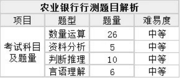 从往年的笔试考情来看,农行的行测主要考察的是数量运算、资料分析、判断推理和言语理解。难度中等,从题量上来看,数量预算占比较多。
