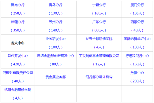 工商银行是全国统一招聘,去年共有38个分行招聘,12个研发中心岗位招聘,其中江苏招聘822人,安徽分行招聘350人,上海地区招聘750人,招聘人数中包含了通用岗、管培岗以及科技岗,工商银行是宇宙行,整体来说每个地区招聘人数是比较多的, 想进的同学一定要认真准备。