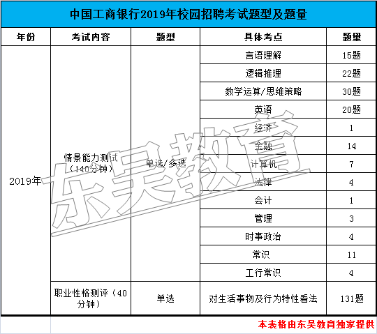 1.2021工商银行校园招聘考试内容暂未公布,根据往年情况,中国工商银行 <http://www.yinhangzhaopin.com/gsyh/>校园招聘笔试内容科目分为情景能力测试和职业性格测评;本质考察的还是:通用素质能力测试(EPI)、综合知识、英语这三个部分。