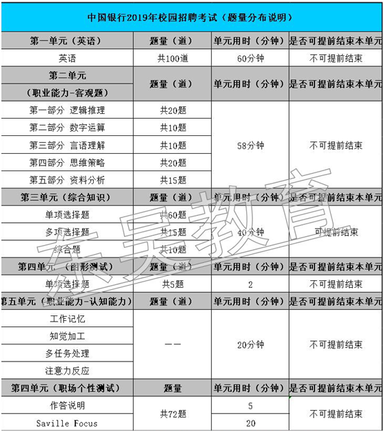 1.中国银行笔试难度基本都是偏大的,考察内容也比较多:EPI、专业知识、计算机、时事政治、英语、认知能力测试、性格测试等等,时长基本在2.5-3.5小时,平均47秒-52秒就要做完一道题,所以每年绝大多数同学题目都是无法做完的。具体如下图