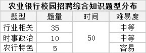 至于综合知识这一块,主要考察的是行业相关,时事政治和农行特色,行业相关题量占比多。
