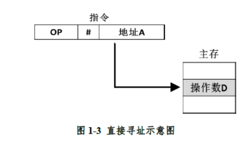 指令中地址码字段给出的地址A 就是操作数的有效地址:EA=A,如图1-3 所示。直接寻址的缺点在于A 的位数限制了操作数的寻址范围,且必须修改A 的值,才能修改操作数的地址。