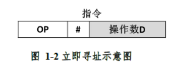 (一)立即寻址在取指令时,操作码和操作数被同时取出,不必再次访问存储器,从而提高了指令的执行速度,如图1-2 所示。立即寻址的特点是操作数本身设在指令字内,即形式地址A 不是操作数的地址,而是操作数本身,也称立即数。由于操作数是指令的一部分,故立即数的大小将受到指令长度的限制。