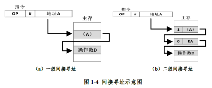 指令中给出的地址A 不是操作数的地址,而是存放操作数地址的地址:EA=(A),如图1-4 所示。间接寻址要比直接寻址灵活得多,它的主要优点为:一是扩大了寻址范围,可用指令的短地址访问大的主存空间,二是可将主存单元作为程序的地址指针,用以指示操作数在主存中的位置。当操作数的地址需要改变时,不必修改指令,只需修改存放有效地址的那个主存单元(间接地址单元)的内容就可以了。
