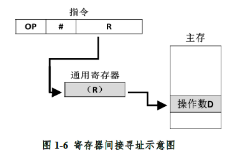 指令中的地址码给出某一通用寄存器的编号,被指定的寄存器中存放操作数的有效地址,而操作数则存放在主存单元中,如图1-6 所示。这种寻址方式的指令较短,并且在取指后只需一次访存便可得到操作数。