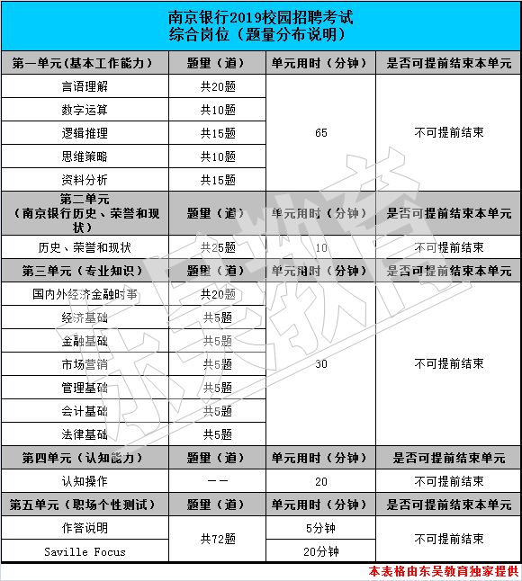 南京银行校园招聘考试具体题量分布说明如下: