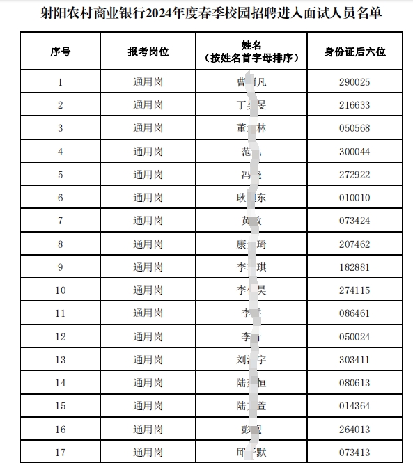 原标题:射阳农村商业银行2024年度春季校园招聘进入面试人员名单