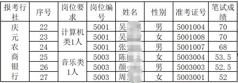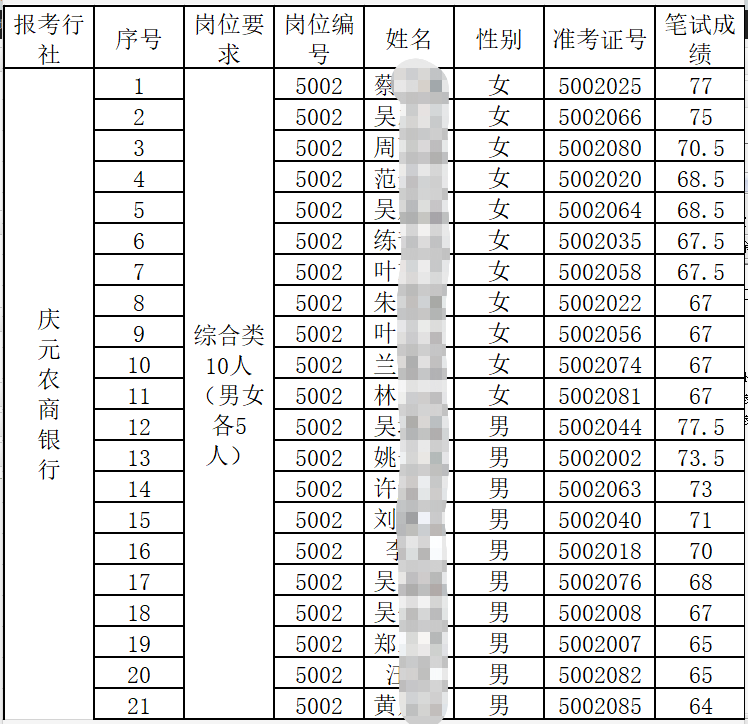 按照《浙江庆元农村商业银行股份有限公司2020年新员工招聘公告》规定,经报名、笔试,根据笔试成绩从高到低确定人员入围面试,现将具体事项公告如下: