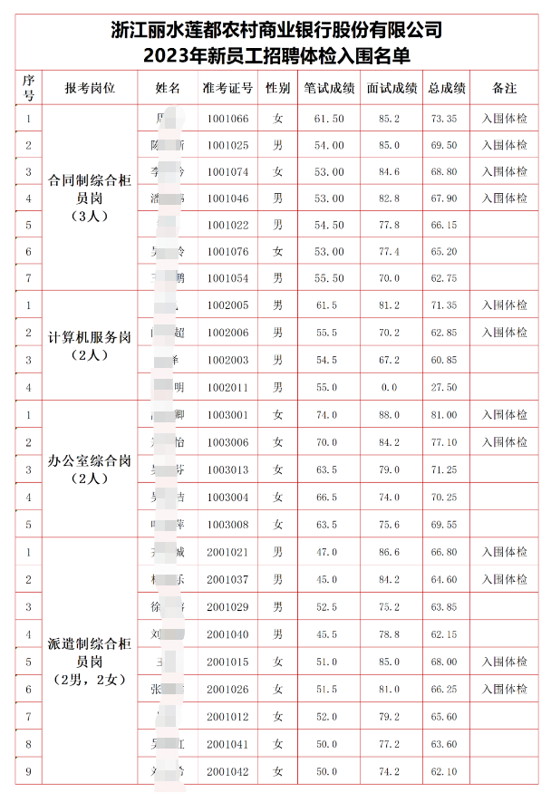 2023年莲都农商银行新员工招聘成绩及体检入围人员名单公示